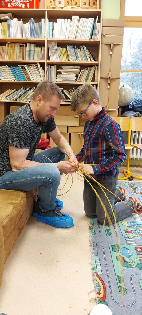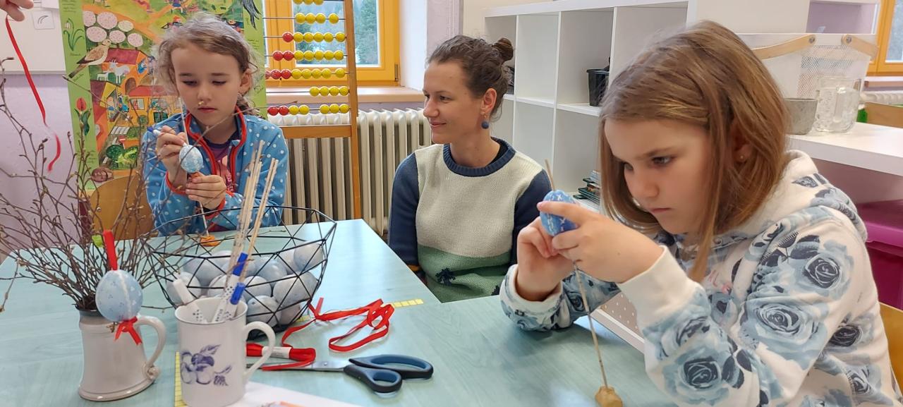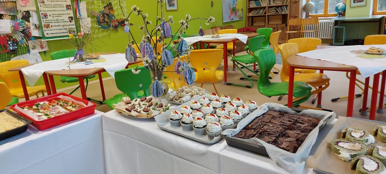 Vlastnoručně upletené pomlázky, malovaná vajíčka a další velikonoční dekorace si mohli ze školy odnést návštěvníci našich dílniček s kavárnou. Prostory školy se proměnily v kreativní dílny lidových řemesel, jedna ze tříd v kavárnu plnou domácích dobrot. Je příjemné občas se vrátit do časů, kdy bylo běžné se scházet, společně tvořit a jen tak u toho „klábosit“. O zásobování kavárny mnoha druhy domácích dezertů a chlebíčků se postarali zaměstnanci školy. Děkujeme místním mužům za jejich čas a ochotu naučit pletení pomlázky i další generaci. Všem návštěvníkům děkujeme za podporu školy a ujištění, že naše společné aktivity mají smysl.
